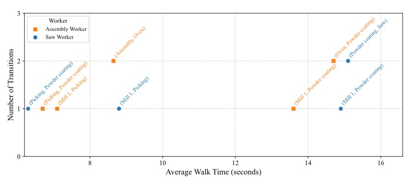 Die digitale Erfassung ermöglicht zudem weitergehende Verarbeitung und Visualisierung: Durch die Definition von Arbeitsbereichen im Layout lässt sich automatisch analysieren, wie lange Mitarbeitende an ihrem primären Arbeitsplatz verbleiben oder wie oft und wie lange sie zu anderen Plätzen laufen. Die aufbereiteten Diagramme dienen als Entscheidungsgrundlage, um Optimierungsschritte schneller und fundierter zu planen und umzusetzen.