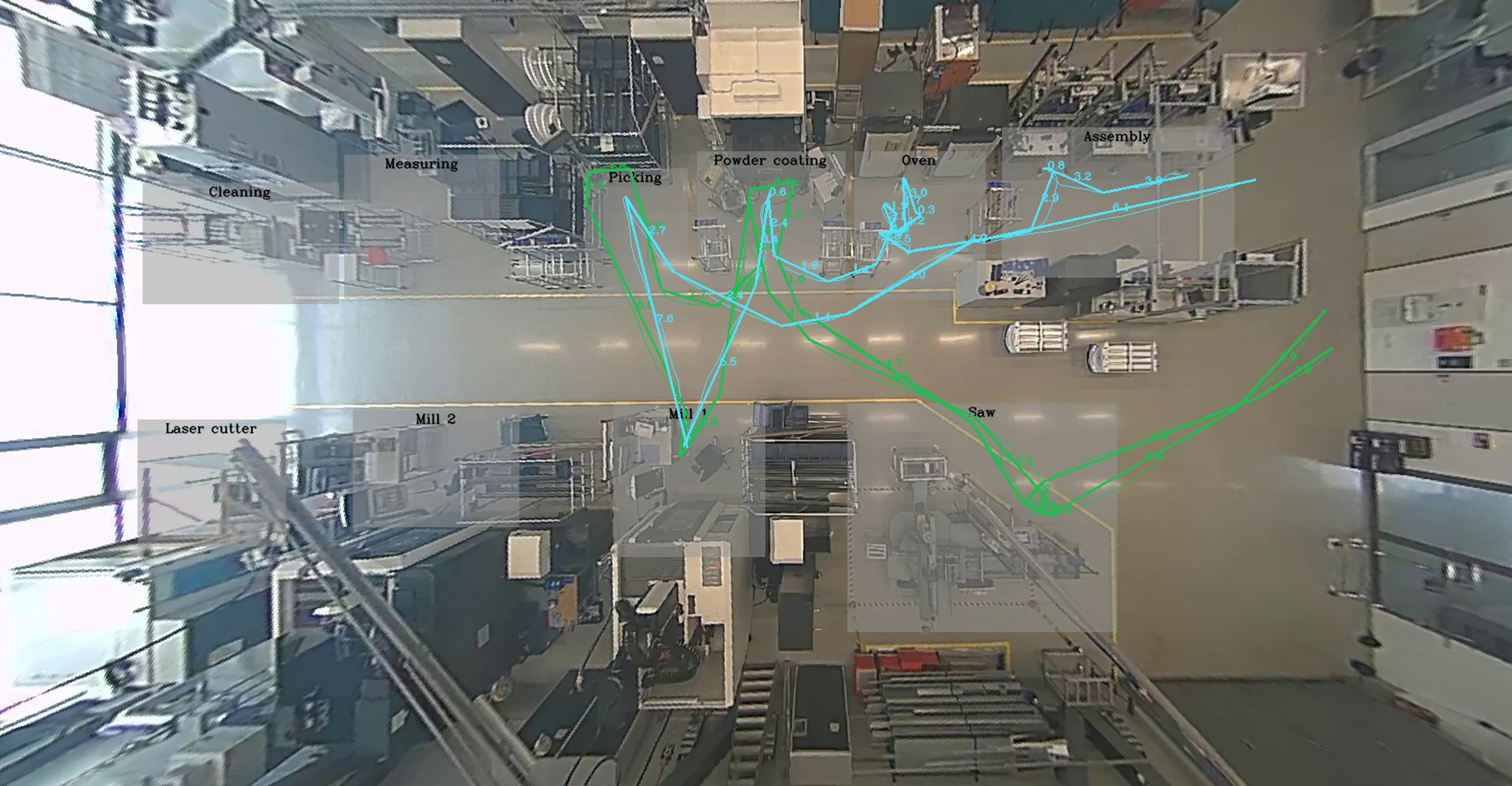 Zur Umsetzung werden in diesem Demonstrator Bilder einer an der Decke montierten Fischaugenkamera ausgewertet, wobei die erfassten Bewegungsdaten anonymisiert verarbeitet werden, um Datenschutzanforderungen einzuhalten. Aus diesen Daten werden automatisiert Spaghetti‑Diagramme auf dem Hallenlayout erzeugt. Die Visualisierungen zeigen die zurückgelegten Routen, die Häufigkeit von Wegen und die benötigten Laufzeiten einzelner Abschnitte.