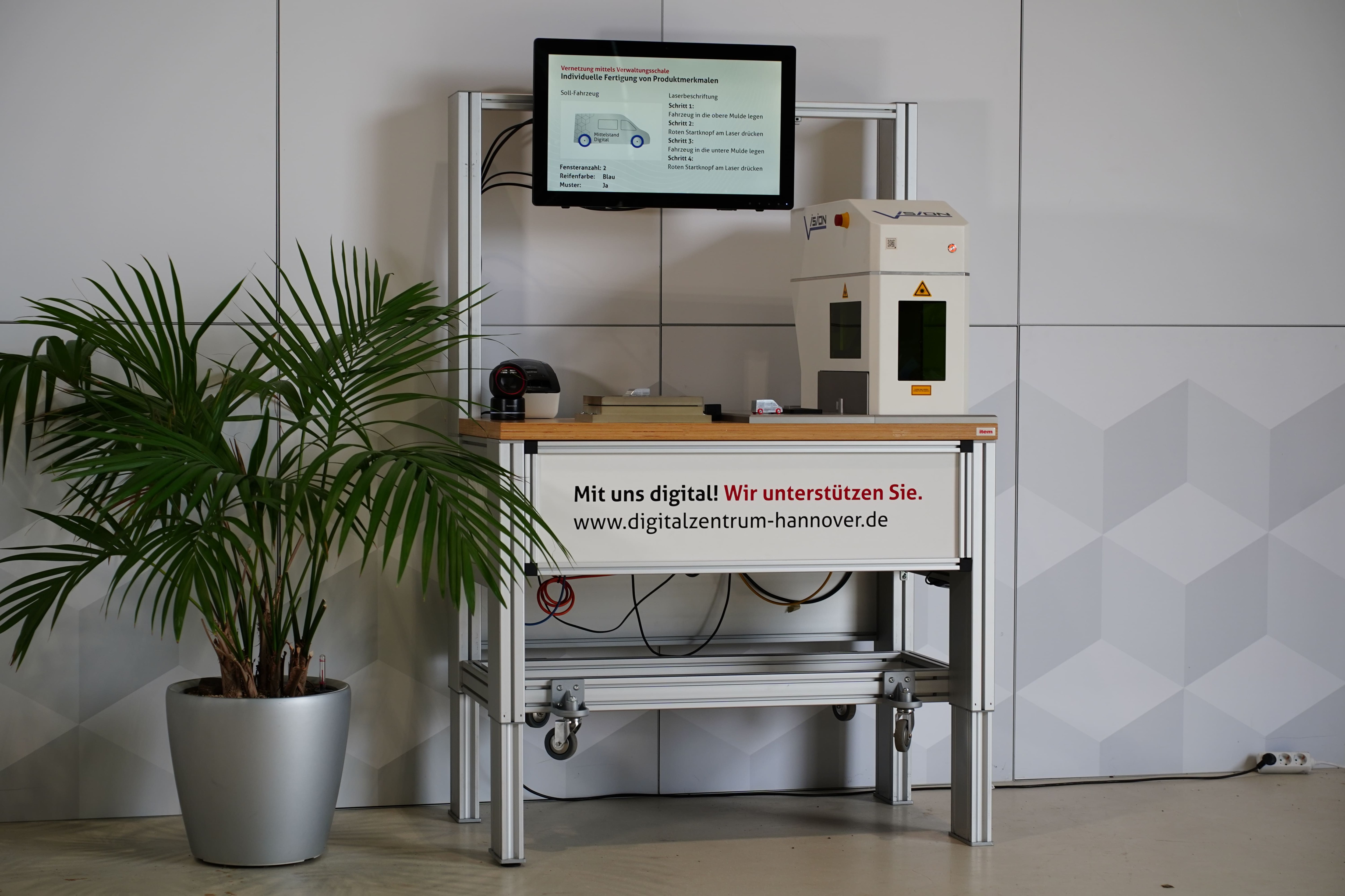Durch das Scannen eines individuellen QR-Codes wird der Abruf der Daten von der Verwaltungsschale initiiert. Auf dem Bildschirm des Demonstrators, werden die Produktmerkmale angezeigt. Zu diesem Zeitpunkt existiert das Fahrzeug lediglich als digitaler Zwilling. Durch die Übermittlung der Informationen an den Laser wird der Produktionsprozess eingeleitet. Verschiedene Merkmale müssen bei der Laserbearbeitung berücksichtigt werden. Wesentliche Produkteigenschaft ist ein frei konfigurierter Schriftzug an der Fahrzeugseite. Dazu kommt je nach Auftrag ein Dekorationsmuster. Jedoch verfügen die Fahrzeuge auch über eine unterschiedliche Anzahl an Fenstern, weshalb die Aufbringung des Musters eine angepasste Aussparung erfordert. Durch die Verfügbarkeit all dieser Informationen in der Verwaltungsschale kann das das reale Produkt gemäß seinem digitalen Zwilling realisiert werden. Darüber hinaus verfügt die Demonstrator Station über eine Energiemessung, sodass die Bestimmung des Energieverbrauches und somit die Berechnung eines äquivalenten CO2-Äquivalentes möglich ist.
