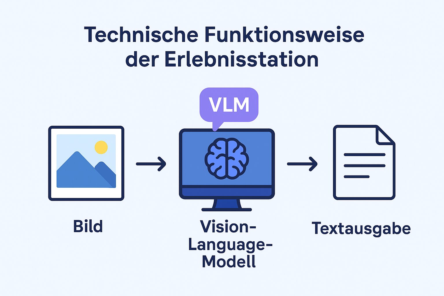 - Die Erlebnisstation basiert auf einem Vision-Language-Modell (VLM) – einer speziellen Form künstlicher Intelligenz, die Bildverarbeitung und Sprachverarbeitung kombiniert. Das System kann ein Bild nicht nur „sehen“, sondern es auch verstehen und in natürlichsprachige Sätze übersetzen.