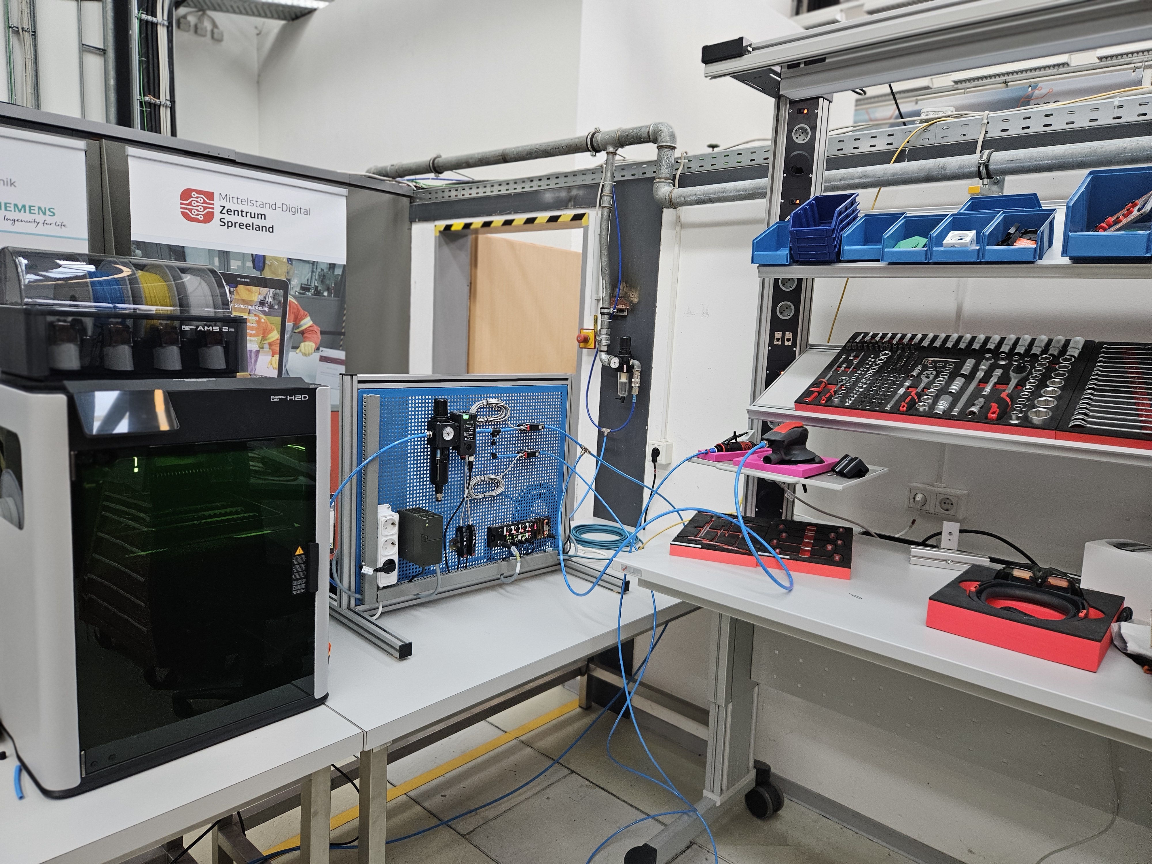 Der energieeffiziente Handarbeitsplatz bildet einen vollständigen Fertigungsablauf ab – von der additiven Herstellung eines Bauteils über die laserbasierte Bearbeitung bis hin zur manuellen Nachbearbeitung mit Druckluftwerkzeugen. Die zentrale Energie-Management-Einheit erfasst dabei mithilfe von Durchflusssensoren und elektrischen Messmodulen alle relevanten Verbräuche, insbesondere Druckluft und elektrische Energie. Über eine PROFINET-Schnittstelle werden die Daten in Echtzeit an industrielle Steuerungs- oder Visualisierungssysteme übertragen. Der Prozess beginnt mit dem 3D-Druck des Werkstücks und gegebenenfalls einer laserbasierten Feinbearbeitung. Anschließend folgt die manuelle Nachbearbeitung mit verschiedenen Druckluftwerkzeugen, wodurch ein realistisches industrielles Arbeitsumfeld abgebildet wird. Der Demonstrator zeigt anschaulich, wie sich Energie- und Medienströme über den gesamten Bearbeitungsprozess hinweg verhalten und wie durch gezielte Analyse und Optimierung Effizienzsteigerungen erreichbar sind.