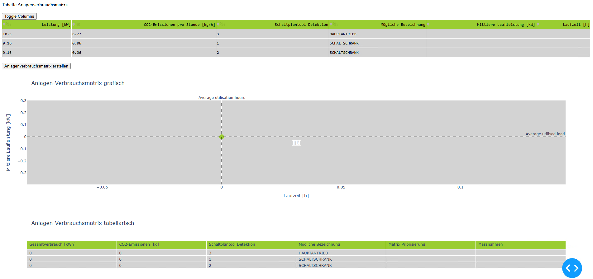 - Möglichkeit zur Eingabe von Auslastung und Nutzungsdauer zur Erstellung eines Energieportfolios (4-Klassen-Matrix) und zur Ableitung von Messprioritäten.
