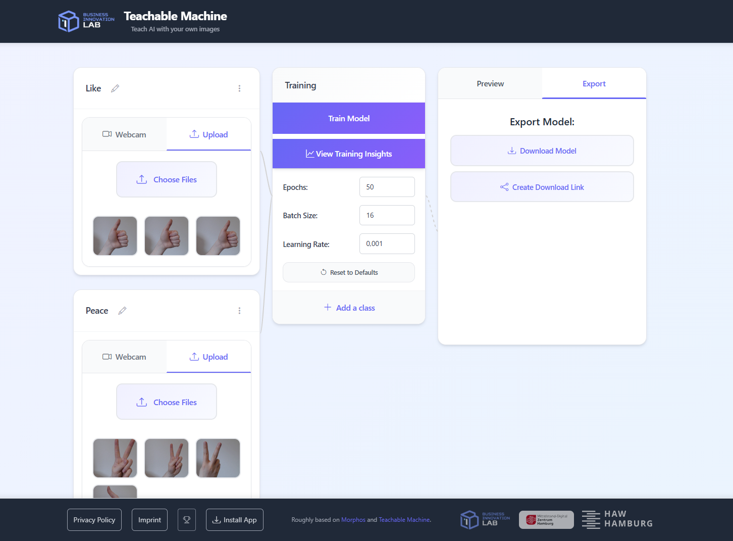 - Live-Preview zeigt dir in Echtzeit, wie dein Modell neue Kamera-Frames klassifiziert.